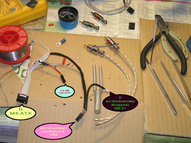 Потом вырезал их тонированного акрила заготовку верхней крышки: Прикинул винт, заходит плотно между резинками даже без осевого крепления (спасибо Chip за подсказанный вариант крепежа), останется потом винтики вставить: После нескольких подгонок очередная примерка: Сварганил кабелёк под М4-АТХ к материнке: ... и пару межблочников под звук (пока аналоговый) ну и на модуль навигации заодно: |