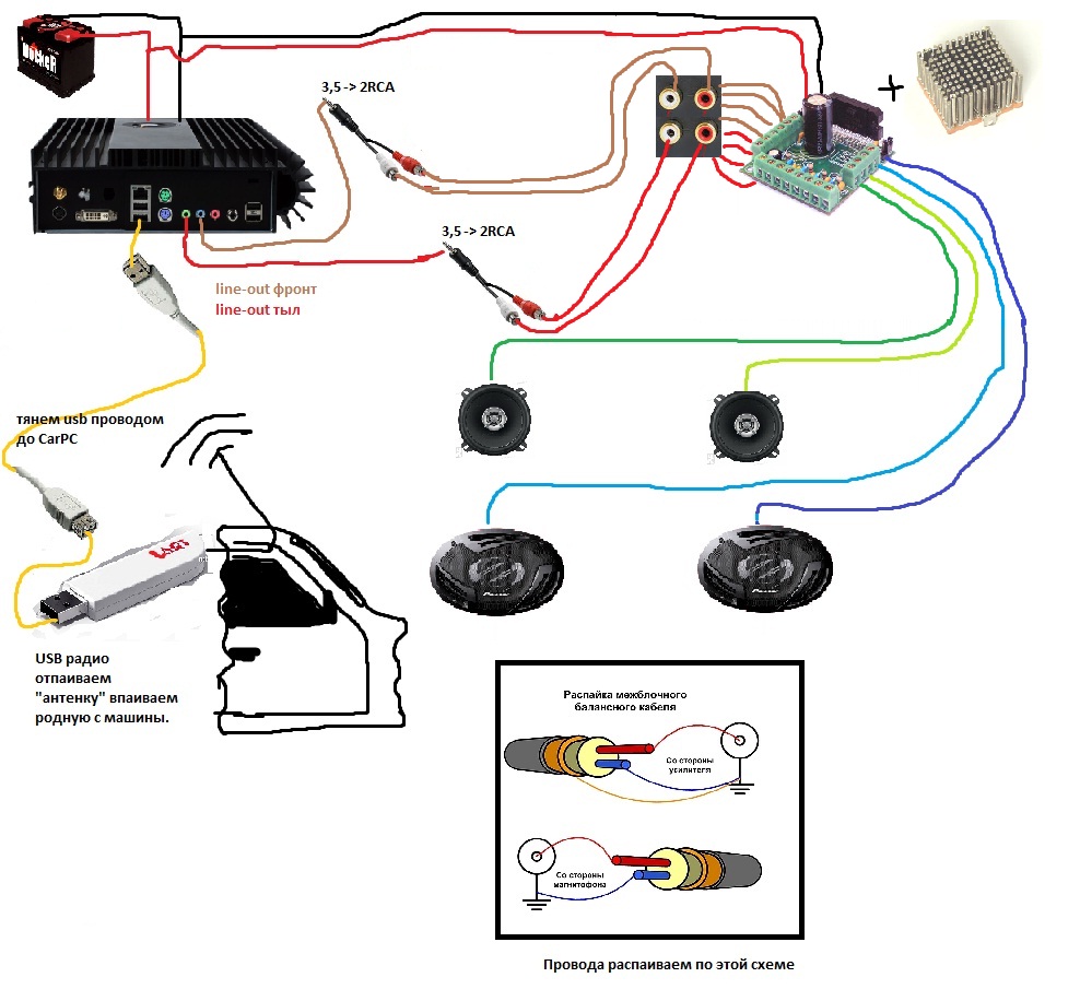 Про усилитель, мне кажется лучше купить нормальный усилок, чем заморачиваться гемором в подключением с майфунного... Сейчас что то так подумал. Или не такой уж там и гемор?=) Пара вопросов к схеме: 1. Кто то говорил что лучше usb радио припаять как можно ближе к антене (автомобильной) и тянуть usb до порта. Правильно ли это? 2. Правильно ли на схеме подключил Mystery фильтры? 3. Нужно ли ставить на питание усилителя какие нибудь фильтры? 4. Можно ли брать питание на усилитель как на схеме? Или тянуть прямо от клеммы АКБ? Кабеля акустические потолще думаю, межблочный как на картинке с экраном, силовые надо хорошие, силиконовые какие нибудь, чтобы с нашей зимой не треснули. Красноярск сейчас за окном -34.5... На каждый силовой Плюс по предохранителю естественно. Замечания, предложения, коректировки, советы, критика только приветствуются конечно же обоснованные ![]() |