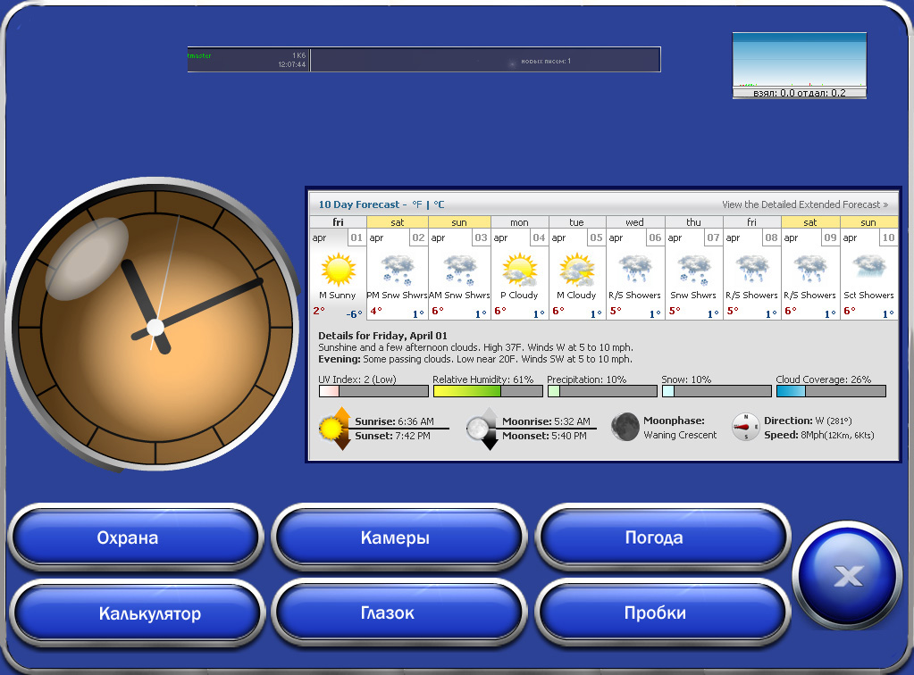 На экране же главного меню (помимо кнопок) планируется флеш с часами и календарем, вывод параметров системы (температура, загрузка проца и т.п.) и (не знаю, правда, насколько это осуществимо) - вывод блока прогноза погоды на 10 дней отсюда.