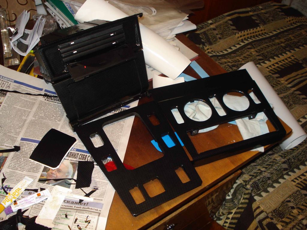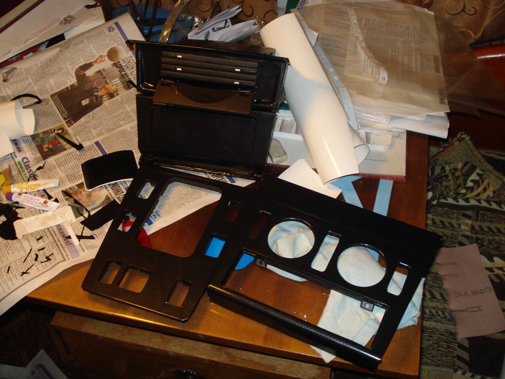 Классно, что в рамке КПП были редусмотрены защелки для кнопок. Оставалось только вырезать 4 окна под кнопки. Начал тянуть пленкой под карбон. Купил хранилище для дисков. Его предполагаеться установить под мафон, где была заглушка.