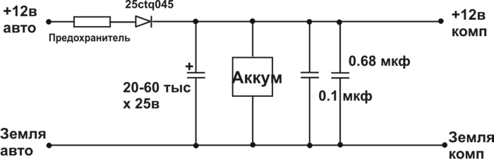 ещё очень рекомендую поставить после аккума и кондёров автомобильный подавитель помех... цена ему 50 рублей... выглядит как чёрная коробочка с тремя выводами - схема подключения на ней же... для надёжности можно поставить lm1084 - тоже после аккума... у меня с фильтром и без lm1084... но работало и по укзанной схеме...