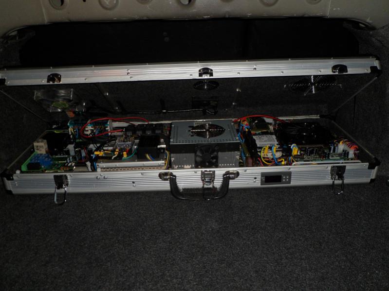 Решил понемногу выкладывать свой проект. Автомобиль Mitsubishi Lancer 2008 года. Проект начат в 2010 году. Первый PC был такой. http://www.pccar.ru/attachment.php?a...1&d=1339696486 http://www.pccar.ru/attachment.php?a...1&d=1339696533 Звук через штатную систему. Сейчас решил немного расширить функционал и собрал все в одном чемодане. Итак: Материнская плата Gigabyte GA-H67N-USB3-B3. http://www.pccar.ru/attachment.php?a...1&d=1339696363 Процессор Intel Core i5-2310 c системой охлаждения. http://www.pccar.ru/attachment.php?a...1&d=1339696629 Память 4Г. HDD WD 320G. Windows 7. БП M2-ITX. BU353 GPS Receiver Сити ГИД для CarPC версии 7.2. Релиз Контроллер питания собран по такой блок-схеме. http://www.pccar.ru/attachment.php?a...1&d=1339696702 Полное обесточивание производится через твердотельное реле на 80А, установленное под капотом. Там же и предохранитель на 80А. Питание АС взято от штатного FM тюнера, смонтированного в чемодане (далее подробно) и развязано через твердотельное реле, для уменьшения нагрузки на линию АС. http://www.pccar.ru/attachment.php?a...1&d=1339696760 Таким образом, отключается вся линия питания от реле под капотом - до багажника. http://www.pccar.ru/attachment.php?a...1&d=1339696835 http://www.pccar.ru/attachment.php?a...1&d=1339696865 http://www.pccar.ru/attachment.php?a...1&d=1339696888 Силовая проводка выполнена кабелем КГ25, который уложен в тюбинг. В багажник, где располагается система, проложены два силовых провода - +12В и -12В. Дополнительное заземление в месте установки системы не делал. Вот так выглядит чемодан внутри. http://www.pccar.ru/attachment.php?a...1&d=1339696959 Так снаружи. http://www.pccar.ru/attachment.php?a...1&d=1339697038 Крышка оклеена листовой резиной для практичности. Вентиляторы: 120мм-на вдув (первый слева). 90мм- на выдув (верхний по середине). Отверстия для вентиляторов - усилителя (нижний по середине) и процессора (правый). Подогрев HDD выполнен на элементе подогрева зеркала, программируемом термореле и настроен на +5С °. Если температура ниже +5- система не заводится -греем HDD до +5, после чего вся система запускается. http://www.pccar.ru/attachment.php?a...1&d=1339697114 http://www.pccar.ru/attachment.php?a...1&d=1339697139 http://www.pccar.ru/attachment.php?a...1&d=1339697265 http://www.pccar.ru/attachment.php?a...1&d=1339697318 http://www.pccar.ru/attachment.php?a...1&d=1339697342 http://www.pccar.ru/attachment.php?a...1&d=1339697369 http://www.pccar.ru/attachment.php?a...1&d=1339697429 http://www.pccar.ru/attachment.php?a...1&d=1339697457 |