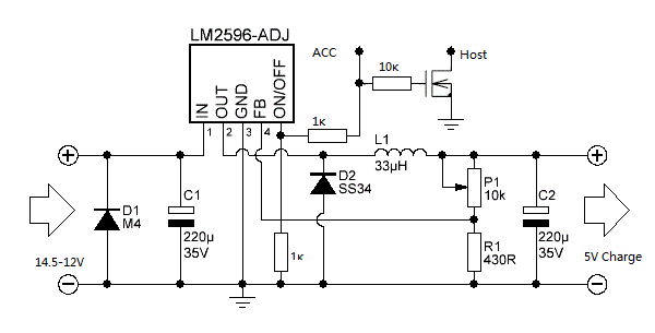 Питание подано постоянно, в машине идет заряд, при подаче АСС заряд отключается и планшет переходит в otg host. По такой схеме для полного заряда нужен примерно час-полтора, потом встроенный контроллер отключает заряд на 100% отметке.