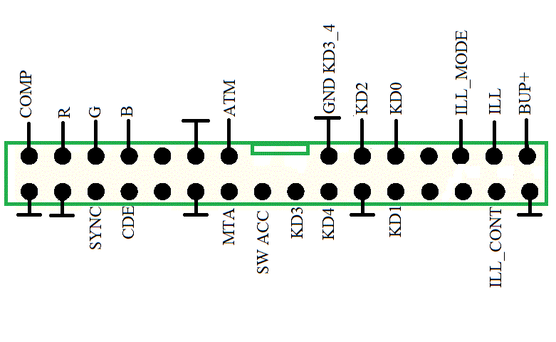 Несколько слов о подключении кнопок, провозился несколько часов без особого результата. Раскидал панель, достал гу и начал отключать разьемы по очереди в надежде найти разьем с кнопками управления, перебрал все разьемы но штатные кнопки упорно продолжали работать... Хотел уже руль разобрать, хорошо что не смог... Последнее место куда я заглянул это был дисплей, оказалось в нем еще и мозги в которые сходятся кнопки руля и панели управления. Вот срисованный разьем дисплея с маркировкой, буквы срисованны с печатной платы дисплея