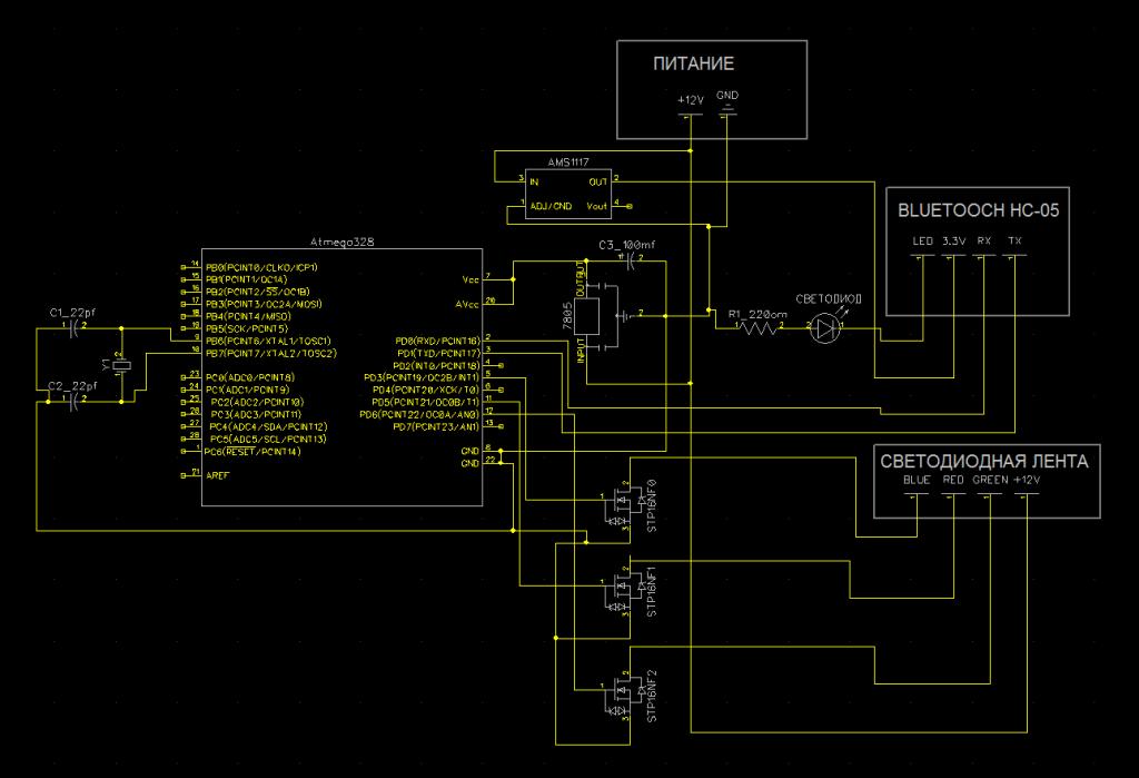 ЦЕНА ВОПРОСА 1 шт) NEXUS7 WI-FI 16GB - 7200 руб с Америки с доставкой 5 шт) LM2596 (питание) - 195 руб с доставкой из Китая 2 шт) Рулевые кнопки (мультимедиа и круиз контроль) 2600 руб с доставкой с autopiter.ru 1 шт Arduino uno + 5 шт контроллеров Atmega328 с загрузчиком arduino 1000 руб с доставкой из Китая. 1 шт OTG кабель с питанием 100 руб с доставкой из Китая. Радиодетали паяльник текстолит хлорное железо олово и т.п 1000 руб в местном магазине ------------------------------------------------------------------------- Птание планшета и зарядка: Организованно при помощи стабилизаторов напряжения LM2596 (Цена на Ebay за 5 шт около 200руб с доставкой (из китая) И также понадобиться OTG кабель с разъёмом питания ОБЯЗАТЕЛЬНО! (Цена около 100руб. с доставкой (из китая) И так для настройки питания и зарядки мне понадобилось 3 таких вот стабилизатора, 2 для того чтобы питать планшет напрямую с аккумулятора машины (батарею нексуса я выкинул) и одна для имитации зарядки планшета при включении зажигания (для автоматического засыпания и просыпания планшета) От одного стабилизатора LM 2596 планшет не включился явно мало тока было, подцепил ещё один параллельно (схема ниже) и вуаля планшет заработал без батареи. Для обеспечения автоматического засыпания и просыпания нам необходим OTG кабель (если конечно мы будем использовать периферию, если нет то он нам не понадобиться, а просто берем зарядку и втыкаем его в микро усб нексуса) подсоеденяем всё по ниже приведенной схеме. ВАЖНЫЙ МОМЕНТ +12 Вольт берем постоянный, т.е. когда вы даже полностью всё отключаете эти 12 вольт не должны отключаться! Зарядка же должна включаться только тогда когда машина заведена или вставлен ключ в замок зажигания (от прикурки например) Далее больше ничего настраивать не надо в прошивке от тимура уже всё сделано скачать можно сдесь, после установки прошивки у вас планшет будет автоматический засыпать при проподании зарядки, ставить музыку на паузу если она включена отключиться wifi bluetooch 3g и т.д, потом если появиться зарядка планшет проснётся, заиграет музыка, wifi включиться и подрубятся ко всему, bluetooch тоже и все флешки клавы тоже, ура товарищи!!! ![]() ------------------------------------------------------------------------- Для создания светодиодной подсветки с управлением с андроид планшета потребуется: 1) Arduino UNO около 400-500 руб с доставкой (с китая) 2) блютус модуль HC-05 около 150 руб с доставкой (с китая) 3) Мофетты STP16NF0 или аналоги (в радиомагазинах стоят около 20 рублей) 4) стабилизатор напряжения на 5 вольт LM7805 для питания Atmga 328 5) стабилизатор напряжения на 3.3 вольт AMS1117 для питания блютус модуля ( этот стабилизатор может не потребоваться если сделать делитель напряжения с 5 вольт) 6) кварц на 16Mhz 7) 1 конденсатор на 100mf напряжением 10 вольт 8) 2 конденсатора на 22 pf 9) Текстолит 10) хлорное железо для травления платы 11) 1 резистор на 220 Ом 12) 1 светодиод 13) светодиодная лента RGB Первым делом как купили всё необходимое, нужно поменять имя Bluetooch модуля с HC-05 на LEDLamp, так как андроид приложение LEDLamp работает только с такими именами. И установить скорость обмена данными на 115200 по стандарту там 9200. PS LEDLamp это обязательня приставка за ней можно давать имена, например LEDLamp_PRIBORKA или LEDLamp_poli и т.д. Как это сделать прекрасно объясняет Дмитрий Осипов на этом видео Далее на Arduino микроконтроллер необходимо закачать вот этот Скетчь Как это сделать в интернете очень много примеров. Далее необходимо собрать схему приведенную ниже и скачать к себе на т