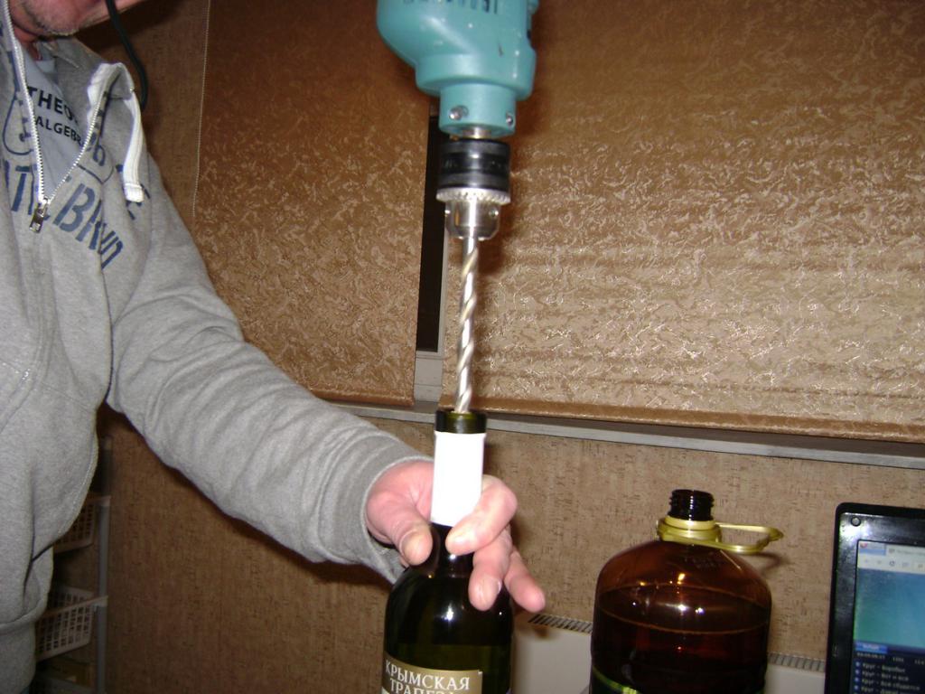 Если бутылка с высоким горлышком и содержимого налито по самую пробку - я посмотрю, как ты её туда протолкнешь.