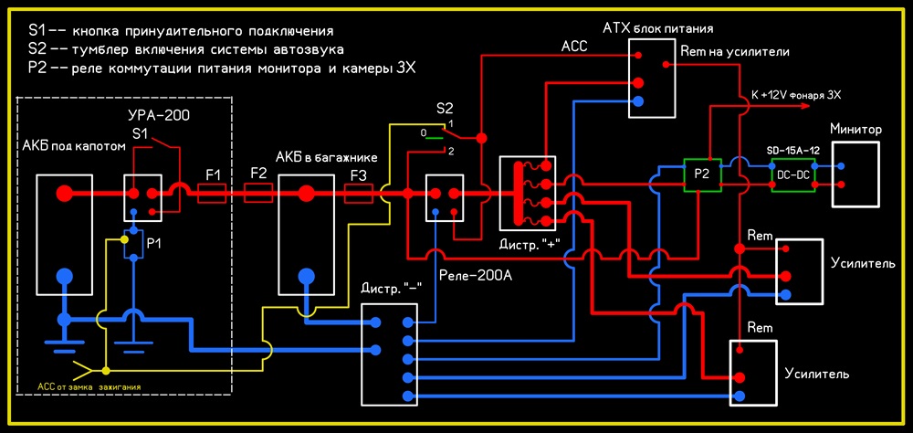 Теперь, что касается организации силовой линии питания всей системы автозвука. Всё, о чём буду говорить -- это моё мнение, не претендующее на "истину в последней инстанции", но реально работающее в машинах, в которых мне довелось делать монтаж аудиооборудования.