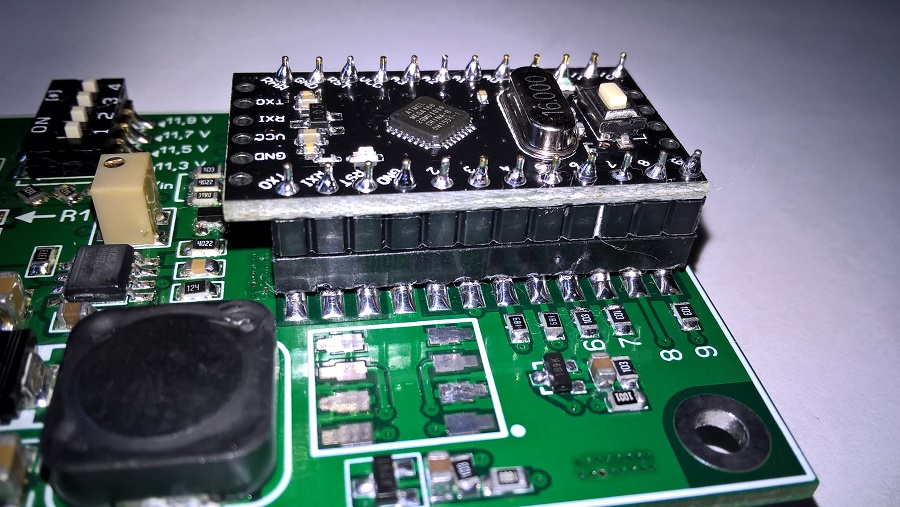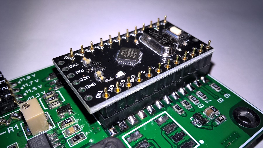 Не всегда можно использовать гнездо на плату со сквозным вариантом пайки контактов для установки плат Arduino. Ниже один из съемных вариант платы Arduino Pro Mini на плате с поверхностным монтажом. Использую цанговые панельки для микросхем, как очень надежное соединение и соответственно цанговые однорядные контакты (они с цилиндрическими контактами).
