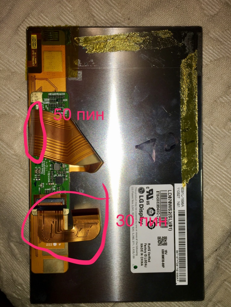 Ситуация следующая: Насколько я понимаю, от самой матрицы идет шлейф, который имеет все 50-пин, входит в плату, далее на "материнку" планшета идет 30-пиновый разъем со шлейфом. Также добрался до тача, он имеет 30-пиновый шлейф, но никаких иных обозначений кроме цифр 7087 не имеет. PS. Один из продавцов скалеров сказал что на данный дисплей я скалер вероятнее всего не найду(((( Прикладываю фото 50-пин от матрицы и далее 30-пин от платы |
