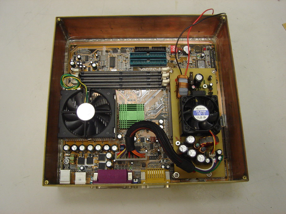 МиниАТХ (21 на 19см), все свое на борту.. прибавляем к 21 еще 5 см на БП в будущем, прикидываем (двд - слим от сидюка, винт - 2.5) получается 22 на 30 см - с головой.. Вентиль один на все про все.. напротив пасивного радиатора на камне - 12см, сверху корпуса (в корпусе вырез).. Внутри умный человек сделает лавсановой (кагтотаг) пленкой "воздуховоды" - направит воздух куда надо.. Мама размещается камнем в "верхнем" левом углу.. Ну как то так ) |