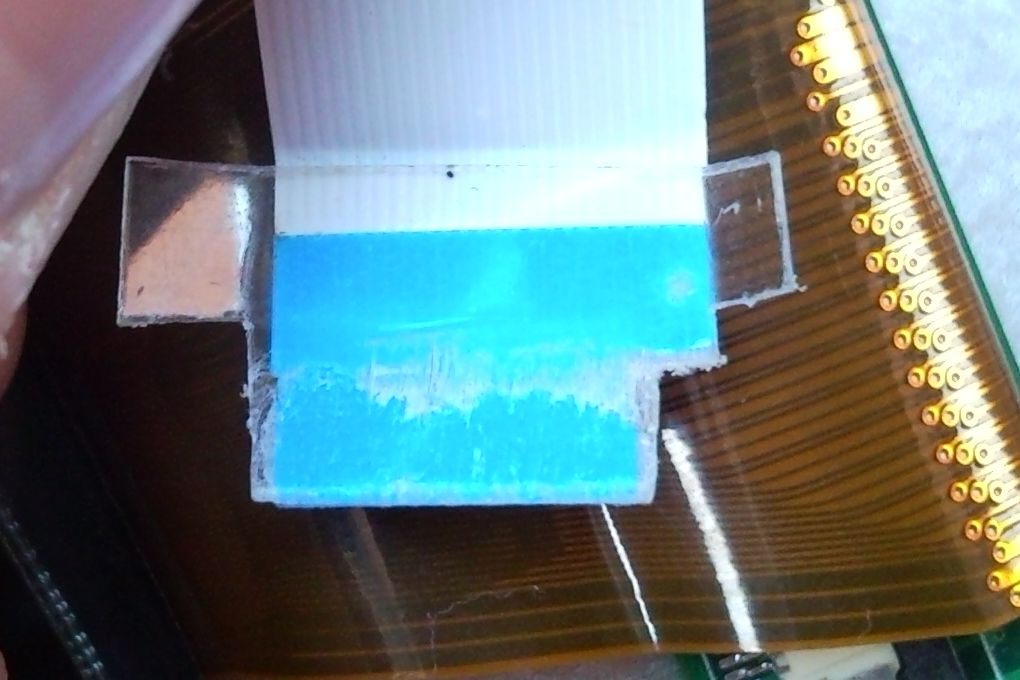 купил в магазине радиодеталей шлейф на 24 проводка, длиной 30 см. Вродебы как он от видика. Шаг проводков у него такой как нам нужен. кончики уже залуженые. оторвал ненужые нам 4 проводка. потом из тонкого пластика (0.3мм) приклеил суперклеем полосочки на концы шлейфа для его утолщения.