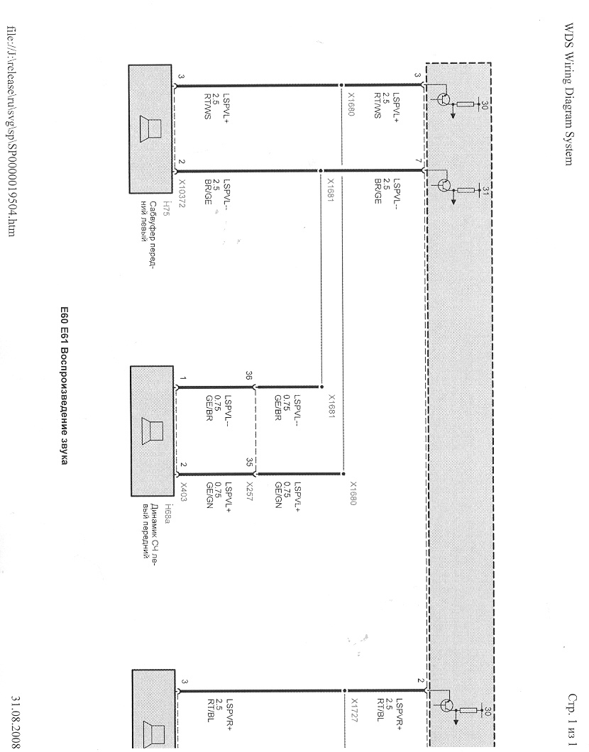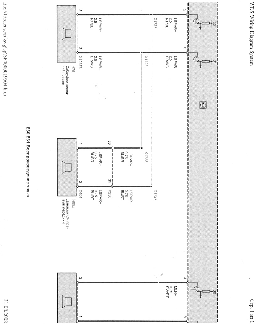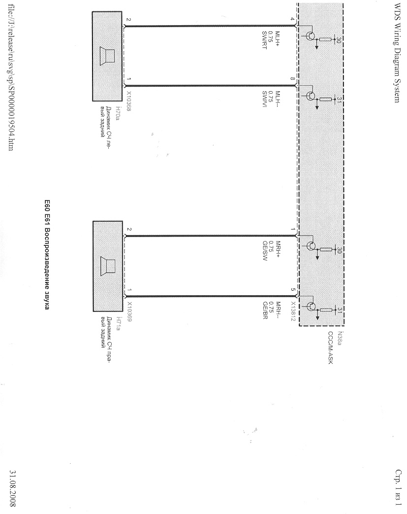 Вот инфа по подключению динамиков к ССС(мультимедийный компьютер) Е60 без усилителя. На рисунке MASK (с одним сидюком), но как я понял по документации, разъем и назначение пинов у обоих одно и тоже. Вот только идти они могут или сразу на динамики или на усилок или DSP. Если нужно знать назначение других пинов этого разъема, то проще будет заиметь всю документацию по электрике БМВ (надо знать детально комплектацию машины и, вообще, долго по схемам концы искать - очень много рисунков). Запускается с СДюка с помощью Internet Explorerа (не требует инсталяции). Ищется на торентах (BMW WDS) или пишите в личку.