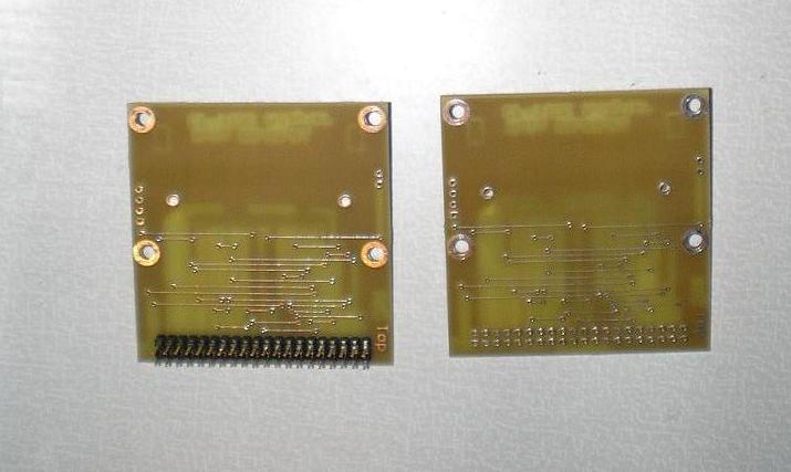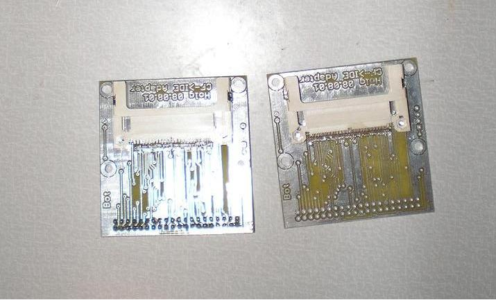 Первый вариант на рисунке 1. Это для тех кому лень или нет возможности сделать п/плату. Схема переходника на рисунке 2. То-что я сделал для себя на рисунке 3 и 4. П/платы заказывались на заводе. В приложенных архивах несколько вариантов переходника CF-IDE. П/платы предназначены для метода лазерного утюга. Слоты для карт CF свободно продаются в Буром Медведе. |