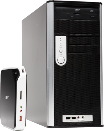 Благодаря наличию достаточно производительного графического процессора, AspireRevo способен воспроизводить видео высокой четкости, в том числе, и в формате 1080p, и вполне подходит для игр, использующих DirectX 10. В компактном корпусе, о размерах которого позволяет судить нижний снимок, где AspireRevo изображен рядом с более привычным ПК, разместился процессор Intel Atom 230, работающий на частоте 1,6 ГГц, до 4 ГБ оперативной памяти, винчестер объемом до 250 ГБ или SSD, устройство для чтения и записи карт памяти «4-в-1». Кроме того, неттоп имеет шесть портов USB 2.0, один порт eSATA, адаптеры Ethernet и Wi-Fi. Подключение монитора обеспечивают разъемы VGA и HDMI.