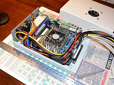 Как сказал Карлсон: - Продолжаем разговор... Купил платку VIA EPIA NX15000, 1Gb памяти, пластмассовую коробку, 5см вентилятор и пару решеточек для вентиляторов,переходник для ноутбучного харда, БП Е10000, взял имевшийся HDD 40Gb. Пришлось сварганить коротенький IDE шлейф. HDD привинтил к дну, сверху на стоечках закрепил маму, коротким шлейфом с переходником соединил их. Поставил БП, всё подключил, кое-где переделав разъёмы. Монитор не работет, поэтому процесс встал до решения вопроса с монитором. Думаю придется вкрячить Mistery на 1/2 din но деньги кончились. Получилось: