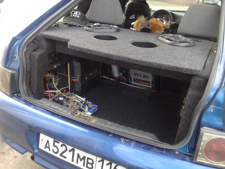 Началось с того, что знакомый подарил бесперебойник без батареи. И я почему то решил, что в машине нужно 220В. Вспомнил, что 3 года назад хотел комп в машину и началось... У знакомого купил двухгодовалый системник IRBIS за 4тыс (мать-фоксон 6110K8MB microATX, камень 1,6Ггц Sempron, DDR400 2*256, DVD CDRW LG, встроенное видео и шестиканальный звук). Поскольку багажник уже был готов и иногда требовался по назначению, решил пожертвовать левой нишей-бардачком. Не стал заморачиваться с корпусом. Мать закрепил изнутри на откидной дверце(идеально по размеру) на проставках. Туда же врезал дополнительный прозрачный вентилятор с подсветкой и грилем(дует на блок питания). Блок питания М4-АТХ на задней части крыла(включает и выключает от зажигания монитор, хаб и три усилителя(два четырехканальных фронт-тыл и двухканальный на саб), на фанерке. Приемник GPS BU-353(USB) примагнитился;-) на гриль мидбаса на корпусной полке. Чуть выше дверцы врезал и закрепил ДВД и 5.25" корпус ViPowER VP-352518 под ноутбучный 2.5" SATA хард. Изготовление мониторной(7" с питанием от БП) рамки с покраской и сушкой в центральный воздуховод заняло два дня( верхняя и нижняя части воздуховодов приклеенны к передней части монитора двухкомпонентной эпоксидкой, дальше стекловолоконная и чистовая шпатлевка BODY, потом эпоксидная высокотемпературная краска(для усиления,6 слоев), и наконец 2 слоя краски под "камень"). В бардачке клава A4Tech KL-5UP, трекбол гениус, картридер через шестипортовый юсб хаб BELKIN с питанием от БП. Фронтенд- ХРюша и ЦЕНТРИФУГА2.1. Навигация- Gis-RX. За шесть тысяч километров (20.08-10.09 ездил в Абхазию и обратно с полностью забитым багажником) один сбой (от тряски выскочил хард(Саратовская область издревне славится на всю Россию "прекрасными" дорогами;-) ) Сейчас монтирую веб-камеру A4-Tech PK730MJ для разговоров с гайцами Вобщем всем доволен(особенно завистью друзей и знакомых;-) ) На карписи ушло три дня (в перерывах между работой), все делал сам. Бюджет Б/У системник(мать,память,камень,привод) 4000р трекбол(был) картридер(был) хаб(был) силовые провода(были) НОВОЕ монитор 7" 7650р(Саратов) БП M4-ATX 4890р(Саратов) хард 2.5" Baracuda 250Gb SATA GPS приемник GlobalSat BU-353 2590р(Саратов) клава A4-Tech KL-5UP 400р 5.25" корпус ViPowER VP-352518 под ноутбучный SATA хард 2000р 10см вентилятор с подсветкой и "ядерным" грилем 190р 3,5метровый USB удлинитель 250р 5метровый VGA удлинитель 190р Плюс где то 1000р материалы Будут вопросы-задавайте. Последний раз редактировалось SRTi; 21.09.2009 в 00:14. |