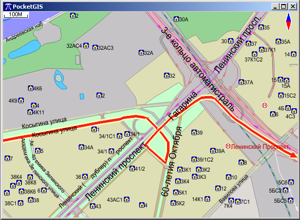 Схема сенсорного интерфейса! ![]() • Setup-Установка программы не требуется. Достаточно распаковать архивы в папку (напр. С:\Program Files\PocketGIS\) Ярлык на рабочий стол можно вытащить "мышью" удерживая ctrl+shift. • Setup-Установка версии для КПК. Файл pgs.exe следует скопировать на КПК в каталог \Windows\Start Menu\Programs\, файл pgs_ru.dll - в каталог \Windows\, файлы карты - в каталог \My Documents\. При первом старте программа спросит имя карты вида msk***.plm • Управление оптимизированно для сенсорного экрана, мыши. Также есть возможность пользоваться многими другими устройствами. • Увеличить масштаб (уменьшить карту) - можно проведя мышью или пальцем по экрану вертикальную линию сверху-вниз. Мышь ведется с нажатой левой кнопкой. Когда программа начнет изменять масштаб карты и курсор сменится можно не отрывая руки провести линию вверх для увеличения карты. Внимание! Для работы этой и других функций необходимо внятно задавать начальные штрихи. На семидюймовом мониторе 1-2см, на больших мониторах - больше. Также работают на клавиатуре PgUp и PgDn и колесико мыши. • Показать Фрагмент карты - можно выделив интересующий участок по диагонали из его левого-верхнего угла в правый нижний. • Пан-смещение. Если провести штрих по диагноали влево-вверх, то включится режим смещения карты. Также этот режим всегда включается при удержании правой кнопки мыши. На клавиатуре - курсорами-стрелками. • Поиск по адресу вызывается штрихом влево-вниз. Подробнее описан ниже. • Точка финиша - конечная точка поездки-маршрута задается штрихом вправо-вверх и через меню. Далее идет полное описание функций экранного меню, но Вы может сразу обратиться к разделу "приемы работы" сразу за ним. • Экранное меню вызывается одиночным нажатием в любой точке экрана. Команды меню. - Сброс - закрывает меню в случае случайного срабатывания. - Поиск - окно поиска по адресу. В левом верхнем поле пишется фрагмент искомого названия. Если заданный фрагмент может быть не в начале названия, то следует переключить соседнюю кнопку Н на *. Компас в таблице указывает примерное направление до указанного объекта. При выделении найденной строки таблицы с названием улицы активизируется меню №д для выбора номера дома из существующих в базе. - Ближайшие - показывает список ближайших объектов с краткой информацией о них. - Финиш - еще один сопсоб задания конечной точки поездки-маршрута. При любых перемещениях по городу программа будет стараться привести Вас туда. • Подменю маршрут. - Стратегия прокладки маршрутов с учетом правил движения и скоростных условий бывает либо быстрее, либо короче. В Москве быстрейшие маршруты часто используют кольцевые дороги. Внимание! Все маршруты немного оптимизированны с точки зрения "здравого смысла" и "удобства" поэтому теоретически можно найти маршрут короче короткого. - Пересчитать маршрут иногда надо если изменились условия на дорогах - появились заторы и т.п. Внимание! Если Вы вручную ввели затор, то маршрут сам перепроложится. Отображать маршрут - всегда включенная функция. Вы ее можете отключить чтобы красная линия маршрута не мешала любоваться картой и своим местоположением на ней. - Сбросить - функция оключения маршрутизации. - Заторы - можно задавть вручную, как и запреты, пробки и т.п. В открывающемся меню сначала задаются свойства затора, потом указывается отрезок дороги, к кторому они относятся. Повторн