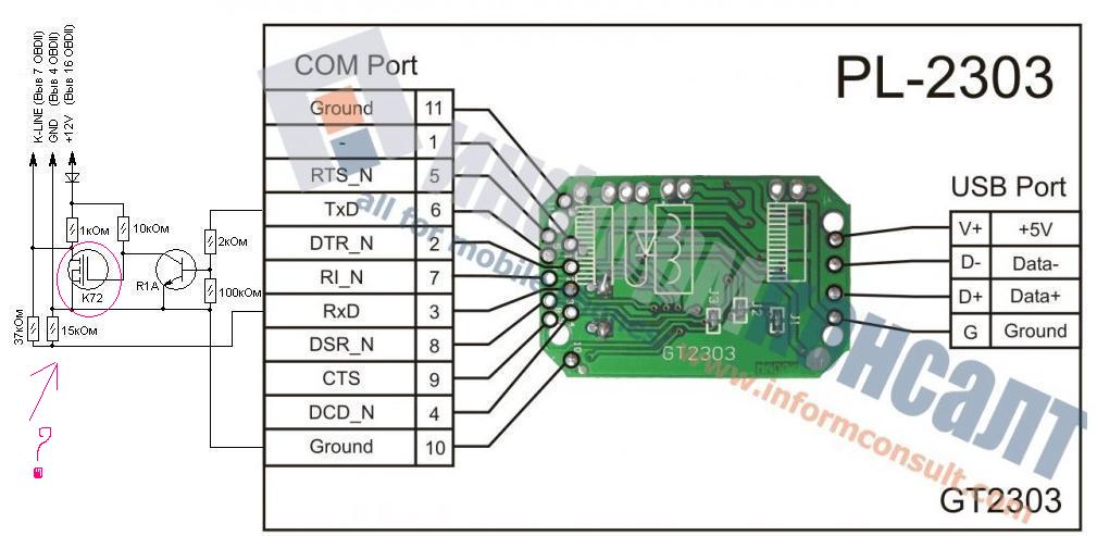 PL2303-KLine.jpg - это самый бюджетный USB-K-Line адаптер. сама плата это раздербаненый GT2303 (USB-RS232 адаптер покупной) на чипе PL2303. то что слева это обвес делающий из RS232 - K-Line так же ты можеш купить уже готовый.... все в первом посте подробно, с ссылками на схемы и примеры адаптеров.