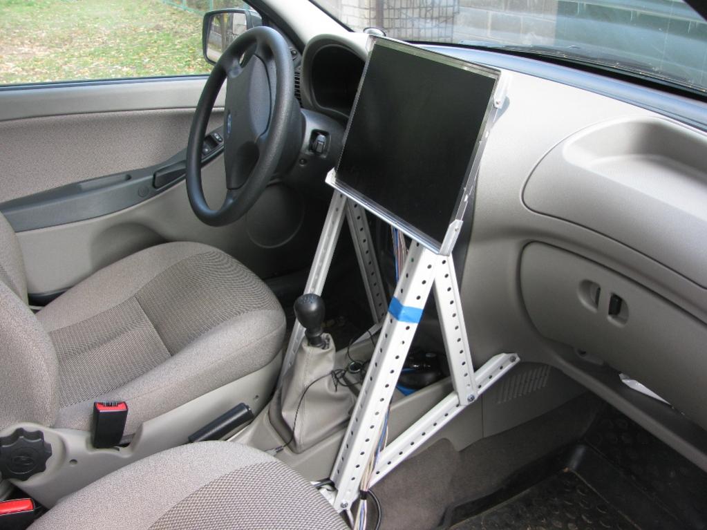 * Это Flatron L1520B; * Матрица отделена от блока питания и логики - удлиннен 20-пиновый разъем от матрицы до контроллера примерно на 90 см проводами которыми прокладывают компьютерные сети (там 8 жил в каждом проводе) - платы блока питания и интерфейса лежат под сиденьем пассажира; * Питание ламп матрицы удлиннено проводами от электропроводки до обычного светильника на 220 (от той же компьютерной витой пары не покатили - видимо посадка напряжения большая); * Питание монитора 220В (пока идет от APC BackUPS 550); * Интерфейсный кабель DVI-I 5м (можно было и 3 метра, но не знал где что будет, когда покупал); * Изображение чистое, никаких помех за неделю езды не заметил; * Угольники стандарные от металлических стеллажей (150 руб за 1.5м в OBI); * Нижнее крепление к передним болтам сидений; * Верхнее (переднее) крепление к тому месту где штатно панель закреплена (там оказалось достаточно прочная рама); * Монитор смещен вправо, т.к. слева уже за руль бы залез и рычагу поворотников мешал бы; * Матрица отдельно, навскидку, весит около 1 кг - на "гребенке" раскачка монитора влево-вправо в пределах 0.5 см (на глаз). На хорошей дороге вообще нет раскачки - все держится оч. надежно; Если не жалко панель, можно прикрепить еще сверху, будет вобще железно; * Регуляторы печки доступны, регулировка неудобств не доставляет, хотя приходится делать это двумя пальцами - сжатая в кулак кисть не пролезает. * Никакой модификации панели не производилось - все можно снять и будет как будто ничего не было. * Тач-скрин в планах (кстати, кто нить знает где в Казани можно купить для 15" матрицы недорого? ![]() Остальное вцелом как у всех новичков в этом деле - УПС в качестве БП, Core2Duo, старенький винт, Win7, GlobalSat 353.. я, как приведу в потребный вид, выложу в виде "проекта". |