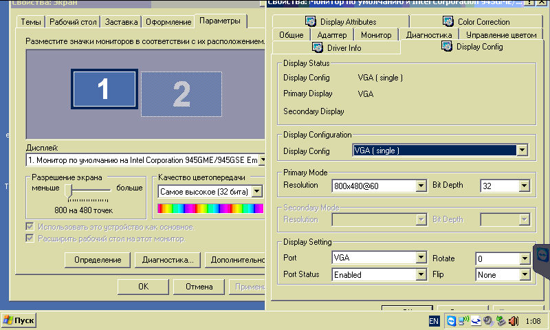 При переустановке на запрос драйвером на видеоадаптер указал на модифицированные драйвера. Все успешно установилось и теперь для второго монитора при подключении спаянного адаптера появилось так необходимое разрешение 800х480. Первые испытания в машине показали, что картинка просто отличная, с небольшими помехами. Напомню - никакого PowerStrip на данном этапе