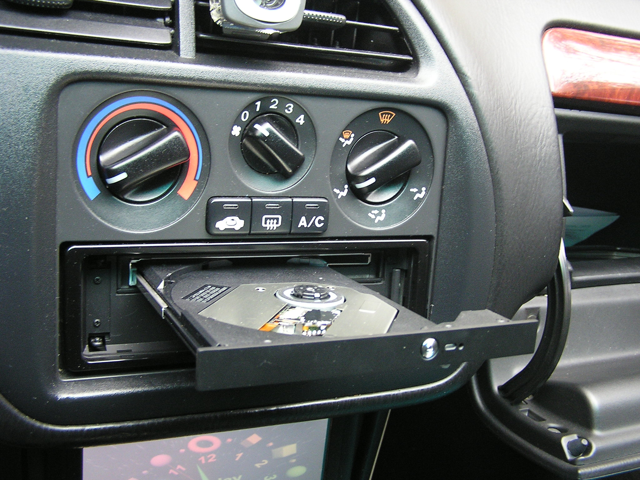 Инсталяция:монитор врезан в центральную консоль вместо часов и ящичка неизвестно для чего,монитор был разобран и с каждой половинки корпуса было снято по 2мм пласмассы чтобы охватить рамку консоли. Головное устройство Nakamichi ,было оставлено из за хорошего звука, но подверглось конкретной доработке: была удалена кассетная лентопротяжка, плата тюнера перепаяна в горизонтальное положение и был врезан пишущий DVD-привод:Asus DVD-RW Combo. Система:мать-VIA M789 с камушком С-3 800мгц,память Kingston 512Mb, Хард Барракуда 160Гиг,ТВ-тюнер GOTVIEW PCI DVD2 Lite с аппаратным декодером DVD,все собрано в корпусе от старого видеоплеера. Да чуть не забыл,монитор перекрашен в черный цвет |