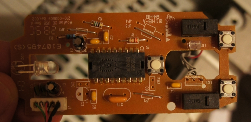 Подскажите, пожалуйста, может кто сталкивался: можно ли подключить поворотный энкодер от магнитолы к контроллеру мышки? Разобрал мышку, там стоит оптический энкодер. В магнитоле всего 2 поворотных энкодера, первый удалось подключить через Ардуино на регулировку громкости, а второй хотелось бы сделать в качестве прокрутки, как колесо прокрутки в мышке. Вот фото энкодера магнитолы и разобранной мышки (успел удалить из мышки оптический приёмник):