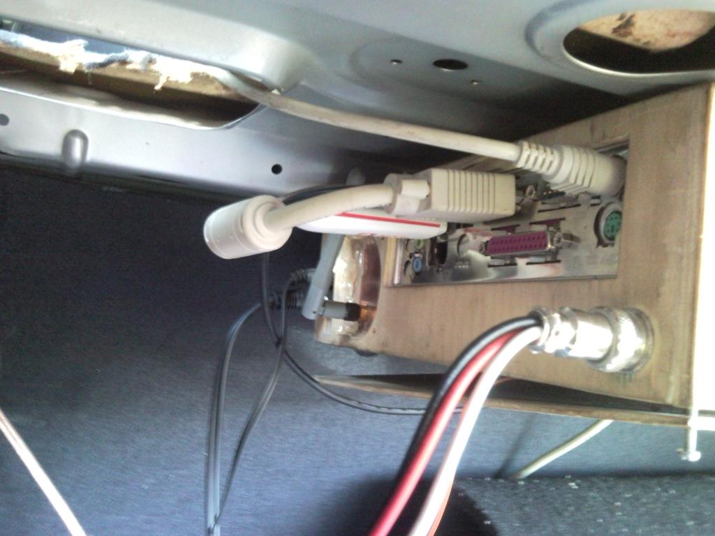 Справа под панелью спрятон свич, подкоючено: Камера, тач монитора, GPS, выносной usb блетуф, запитано стабилизатором 5в вырезаный из монитора и подключен через реле, при включении компа подается питание на свич.