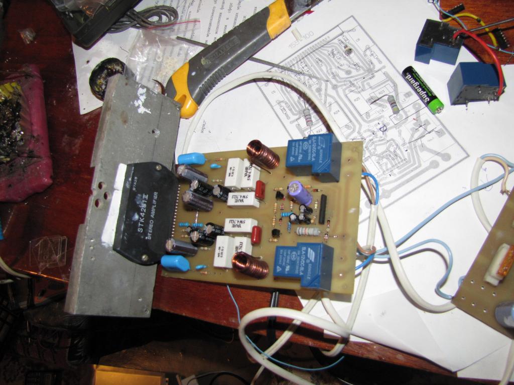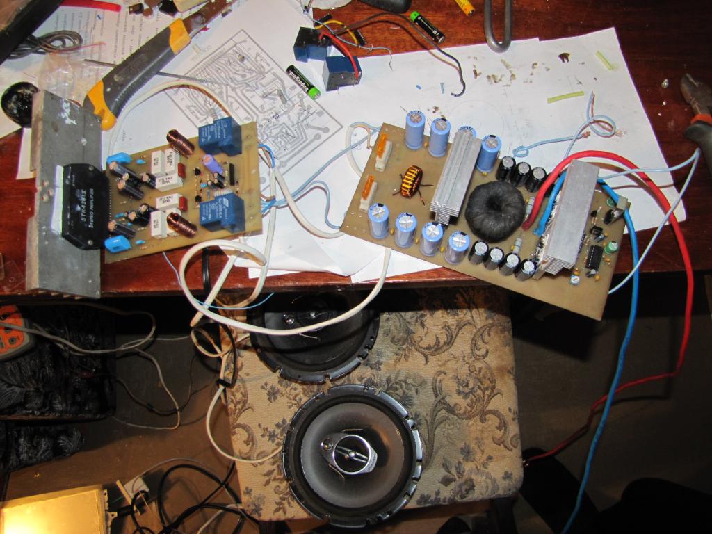 Поразмыслив над разными вариантами, пришел к выводу, что УЗЧ соберу сам. Схемотехнику усилителя перебрал разную: транзисторную (Ланзар, Стонколд) – отказался из-за габаритов и необходимости в проведении настройки каждого усилителя; на микросхемах (TDA, LM, гибрид (STK)). Выбор был сделан в пользу гибрида (STK), а конкретнее STK4231, она представляет собой 2-х канальный усилитель выходной мощностью 100Вт на канал и сопротивлением нагрузки 8Ом. На УЗЧ поставлена защита от постоянного напряжения на выходе – UPC1237; а так же от нагрева STK и БП (ПН). Для питания усилителя был собран преобразователь напряжения мощностью 500Вт с выходным напряжением 51В в плече. Со сборкой, схемой и настройкой БП (ПН) можно ознакомиться по ссылке http://forum.vegalab.ru/showthread.php?t=47320 – СПАСИБО автору и тем, кто принимал участие в разработке. ПН Схема усилителя звуковой частоты была взята с даташита STK4231, к ней я добавил защиту от постоянного напряжения на выходе http://cxem.net/sound/amps/amp162.php. Пробный запуск усилка и ПК. Результат прослушивания музыки, оказался выше, чем я ожидал. Хотя я, не меломан, но музыку люблю, меня поразила мощность усилителя, про качество звучания ничего говорить не буду, у каждого человека на этот счет свое мнение и вкус, а в автозвуке за качество отвечают многие факторы в совокупности, не только усилитель. Да, можете не говорить, и так вижу прекрасно какой, бардак я развел в квартире, за что и сказал СПАСИБО своим близким за долгое терпение моих увлечений. |