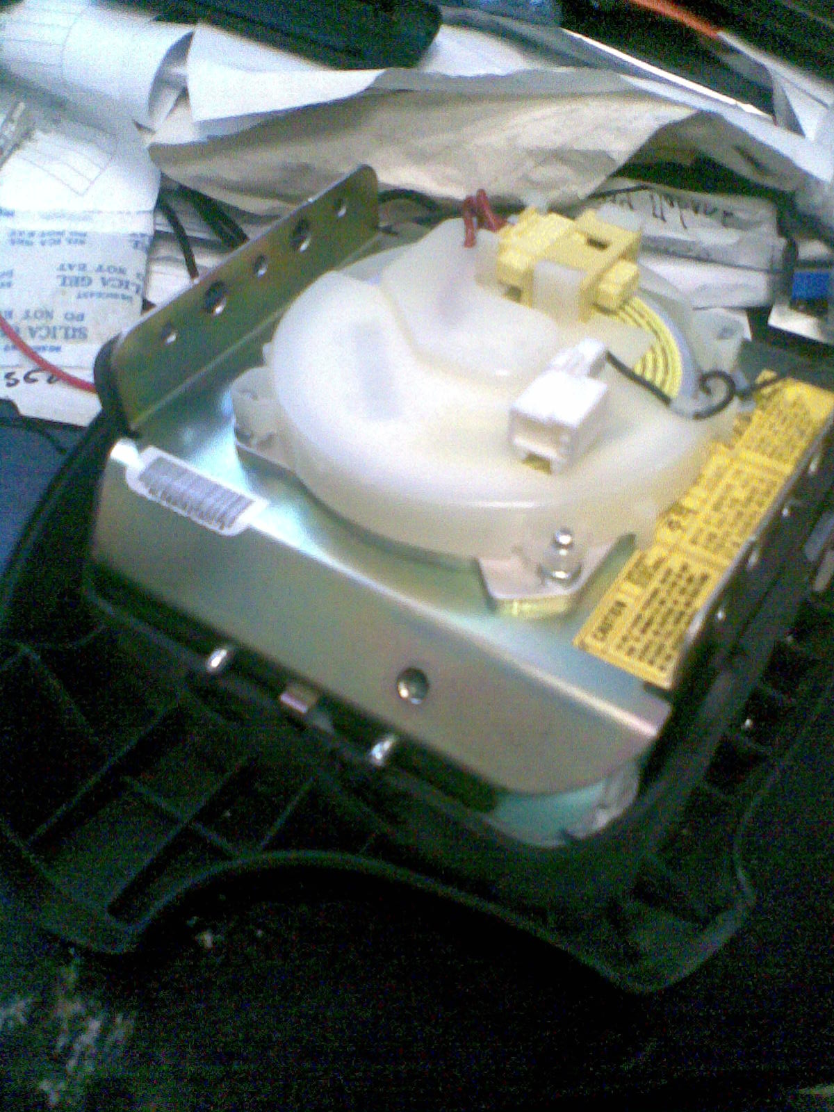 заклинило на моем корейце клаксон, точнее как, в обычном режиме, пока едешь он может непроизвольно сработать, или ночью на стоянке заклинить или еще чего-нить... чтоб отключить надо было со всей дури шлепнуть по подушке (стремно) пару раз, тогда отрубался... в общем меня это малость напрягало, я тупо снял предох от клаксона и жил спокойно... а вот сейчас решил поглядеть чтож там унутрях, либо делать, либо покупать новую подушку, (стоит она около 600 у.е.) разобрал и руки опустились.... ![]()