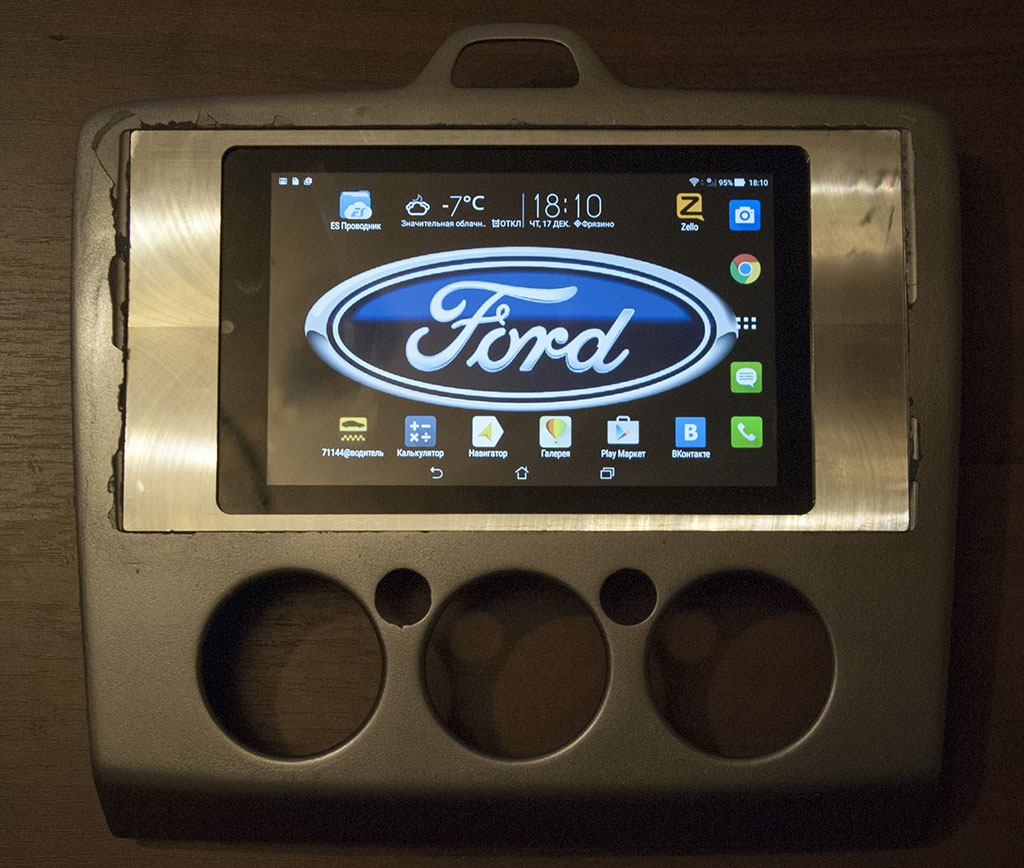 Не прошло и трех лет, как мне изготовили переходную рамку. Решил использовать полированный алюминий. Старый сломанный планшет пришлось удалить из рамки. Дело осталось за малым - перенести магнитолу вниз. За это время планшет успел смениться на Asus Fonepad ME372CL. Он хорош тем, что имеет подходящие габаритные размеры и 4G на борту.