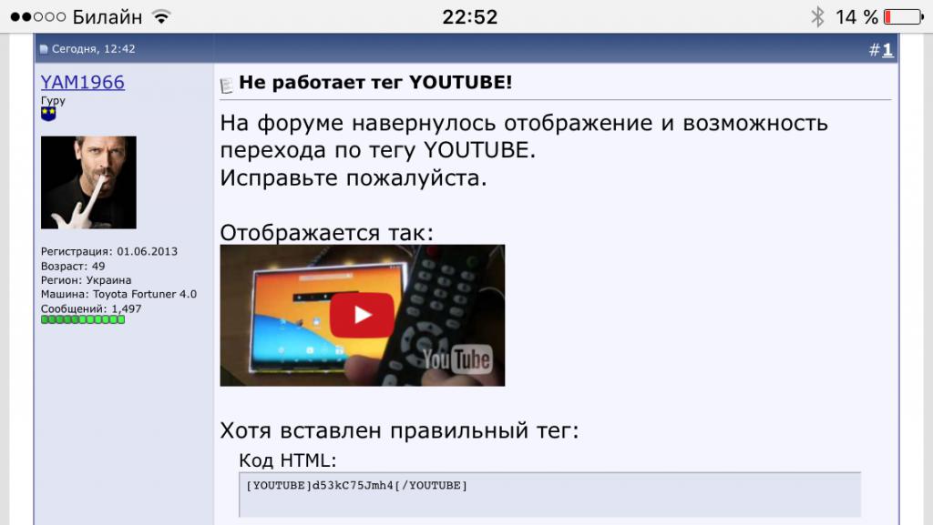 На форуме навернулось отображение и возможность перехода по тегу YOUTUBE (хром).