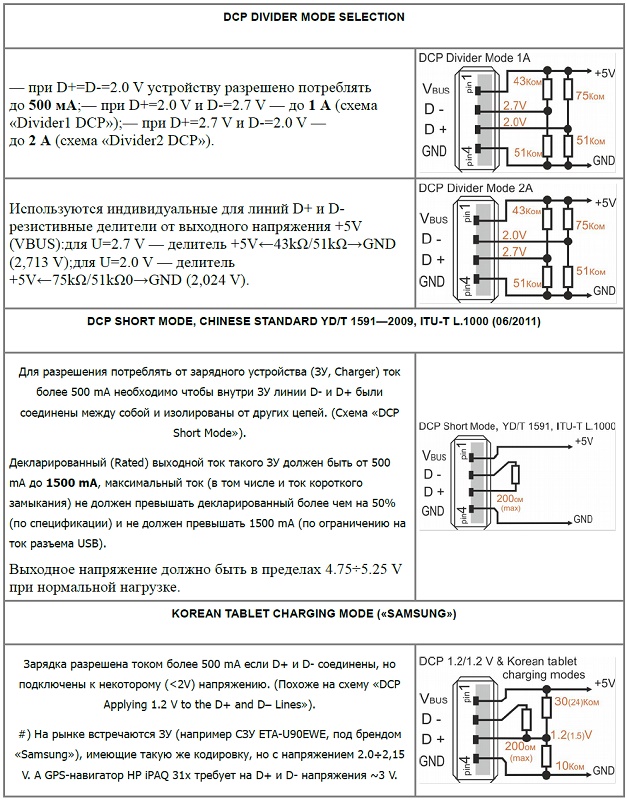 "Устройство поддерживает четыре наиболее распространенных протоколов: • USB для зарядки аккумулятора Спецификация, Редакция 1.2 (ВС1.2) • Китайская телекоммуникационная отрасль стандартным yd/Т 1591-2009 • Режим делителя • 1.2 В на D+ и D– линии М/Т 1591-2009 является подмножеством ВС1. Спецификация 2 поддерживает подавляющее большинство устройств, которые осуществляют зарядки USB. Делитель и 1.2-в схемы зарядки поддерживается в устройствах с конкретными популярных производителей устройств. ВС1.2 имеет три различных типов портов, перечислены ниже. • Стандартный выходной порт (SDP) • зарядка вниз по течению порт (CDP) • специальный зарядный порт (DCP)" - это перевод из описания на микросхему tps2513. |