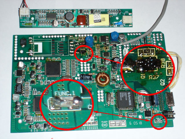 основные неисправности 1.подсветка 2.матрица 3.электроника/редко/ 1.подсветка лечится заменой 2-4 транзисторов и конденсатора причем менять сразу все....советы у кого есть моники....../пропаять трансформатор покрыть контакты цапонлаком и поменять этот злополучный кондер на любой от 0.01 до 0.15 мкф/я ставил любые/и не ставьте толстый перемычка вместо предохранителя.....чревато выгоранием дорожек......но и в этом случае есть выход.....использовать инвертор от ноутбука......./испытаны штук 5 разных/ методику изложу позже как появятся фотки 2.если матрица вдруг засветилась белым и нет изображения-возможная неисправность внутри матрицы/ на маленькой платке есть предохранитель/..меняем наслаждаемся)либо пмтание матрицы на основной плате......но редко 3.имхо у контроллера есть серво режим.....и при определенной комбинации клавиш можно подпортить прошивку......осторожней при переделке кнопок для начала все) ![]() |