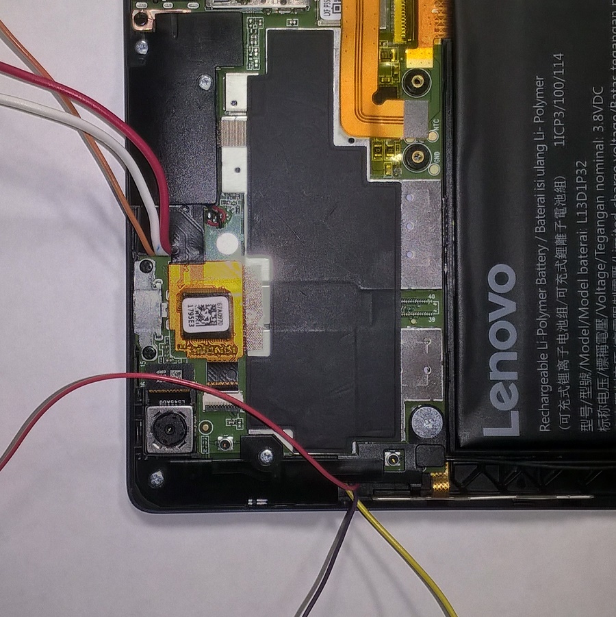 Подключение питания на Lenovo TB3-850M во многом похоже на подключение Samsung Galaxy Tab S 10.5 SM-T805. Батарея удаляется, контроллер остаётся (только потому что имеет специфический разъём на гибком ленточном шлейфе и припаивать к шлейфу провода не совсем удобно). К контакту "плюс" на контроллере припаивается провод, который подключается к положительному выходу внешнего DC-DC преобразователя. К контакту "минус" на контроллере ничего не припаиваем. "Минус" от DC-DC преобразователя припаиваем к общей "массе" на материнской плате планшета ( корпус microUSB разъёма). Напряжение питания планшета 4,5В.