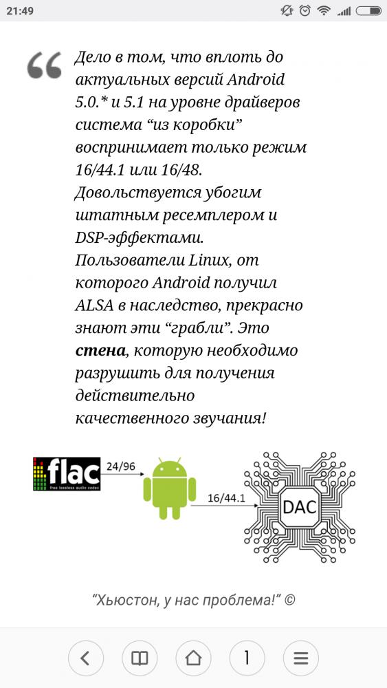 Собственно искал конкретную тему на форуме, но все не в отдельной теме, а разбросано по форуму. Вопрос достаточно бональеый: давно известно что в андроид 5.0 - 5.1 есть внутренний даунгрейд до 44 кГц. Пытаюсь понять найдено ли решение как его обойти , и обобщить в одной теме. На андроид 6-7 у меня как и у вас проблем нет )) Используется дешёвый планшет archos 70b neon на mtk8163(он только вышел как я понял, и прошивки кроме стоковой в сети нет). Поёт через usb -dac из коробки. Но там где андроид 6-7 не ограничивает частоту, то 5 всем известно что опускает вниз, до 44100 всегда!!! На данный момент есть uapp и нейтрон - последний и предпочтителен. Подскажите, или ткните где то было обсуждение решения? Ниже скрин с одного стороннего сайта, для того чтобы не спорили те кто не в теме что проблема есть! И если смотреть внимательно, то именно андроид, ДО вашего любого цапа делает ресемпл, то есть bit perfect как я вижу у себя - не помогает Audio.policy - правил ту часть где usb output до 48000 - перегружал, права исправлял. Изменений не вижу, всё так же 44100 Последний раз редактировалось ticc29; 25.12.2017 в 08:44. |