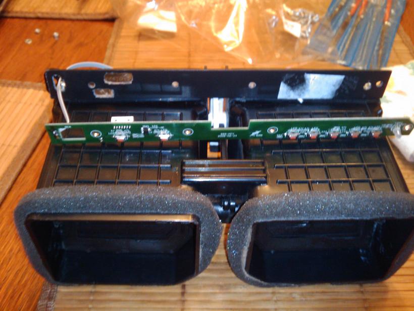 Видимая часть матрицы располагалась великолепно, но вот невидимая только если подрезать воздуховоды(буквально на толщину пластмассы, но по-другому никак не влезала матрица, пришлось подрезать), как назло, место подрезания приходилось на ту часть где проходит крепление между двумя половинками воздуховодов, чтобы механизм открытия решёток работал как и раньше хорошо, крепление после подрезания перенёс, сделав его из куска пластмассы от рамки и всё тойже волосатой шпатлёвки, вот что получилось: