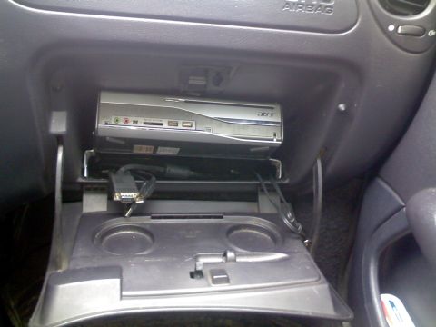 Долго думал куда буду устанавливать компьютер. В багажник - далеко и не хотелось тянуть длинные провода, под сидушку - слишком мало места (малогабаритное купе как-никак), да и если его туда поместить то зимой вся вода с ботинок задних пассажиров будет на нем. Было решено установить компик в бардачок - ему места там хватило как раз. В торце бардачка было вырезано 2 прямоугольные дырки под вентиляцию и подвод проводов