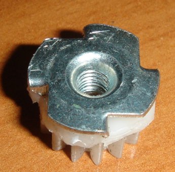 Большая белая шестерня из разобранного сидирома. В нее вживлена хитрая гайка из магазина крепежа, изначально думаю она предназначена для вбивания в дерво или ДСП и имеет острые "зубы". Вот она же вживленная в другую шестерню.