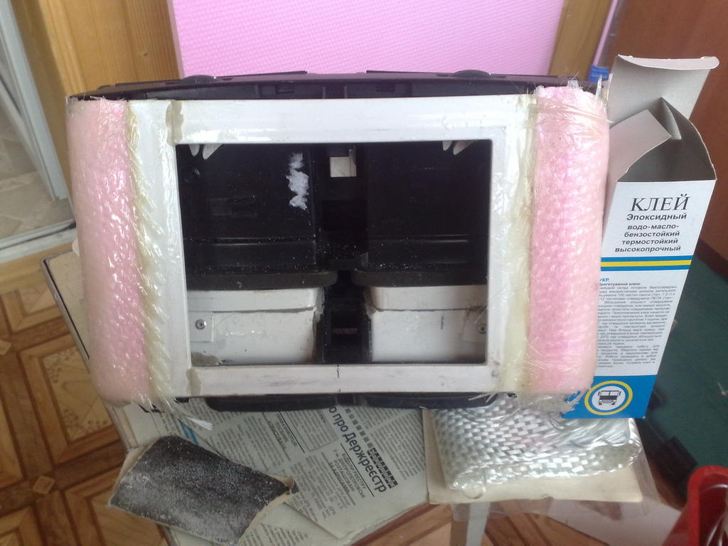 Воздуховоды были отделены от ящичка, у ящичка была снята крышка и стал вопрос о ровной рамке для монитора. В Эпицентре наткнулся на лючек для водопроводных кранов. Его проем четко по высоте совпадал с видимой областью экрана. По длине - был чуть длинее что было исправлено ножевкой и приклеено эпоксидным пластилином. Тем же пластилином рамка приклеена к корпусу ящичка. Но так как воздуховоды все же хотелось сохранить, принял решение их вывести на верх корпуса монитора... В итоге пришлось купить на разборке еще один ящичек. Ох и навызванивался я разборок пока его нашел... Ну и первая примерка в авто... Тут было важно угадать, так чтобы рамка была четко вертикально. |