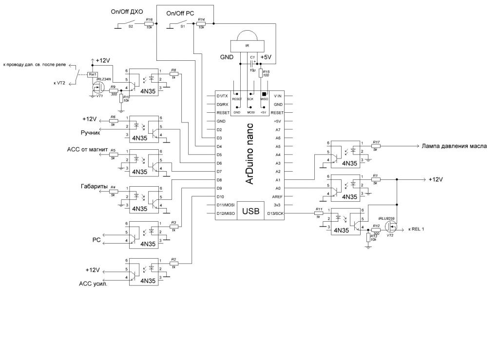 P.S. У меня БП компа с гальванической развязкой по массе, по этому масса на схеме нарисована двумя обозначениями. От чего питать CarDuino пока не решил, по логике он всегда должен быть включен, тогда питать надо от авто, но тогда теряется весь смысл гальванической развязки. Или как? Извиняйте, но из за этой проблемы схема полностью не дорисована, так что и здесь тоже прошу помощи. Логика работы CarDuino Первое по контроллеру БП. 1. Включаю магнитолу 1) Включается усилок 2) Включается БП 3) Включается комп 2. Выключаем магнитолу 1) Выключается усилок 2) Через одну минуту корректно выключается комп 3) Выключается БП через десять секунд после выключения компа 3. Нажимаем кнопку включения компа в течении одной минуты после выключения магнитолы 1) Комп остаётся работать 2) Усилитель все равно выключается 4. Нажимаем кнопку включения компа (с магнитолой или без) 1) Корректно выключается комп 2) Выключается БП через десять секунд после выключения компа 3) Усилитель – если магнитола работает, остается включен 5. Напряжение питания 10,5 вольт 1) Выключается усилок 2) Через одну минуту корректно выключается комп 3) Выключается БП через десять секунд после выключения компа 6. При включенной магнитоле, кратковременно выключаем-включаем магнитолу (в течении 10-15 секунд) 1) Ничего не происходит 7. Нажимаем кнопку включения компа 1) Включается БП 2) Включается комп 3) Усилок остаётся выключен 8. Кратковременные понижения напряжения (кручу стартер) 1) Ничего не отключается Второе по Дневным ходовым огням (ДХО). (подключение производится на дальний свет) 1. Включаем зажигание 1. Фары выключены 2. Включаем стартер 1. Фары выключены 3. Двигатель завелся (контроль по лампе давления масла на приборке) 1. Через 10 секунд включаются фары на 30%( при условии, что ручник опущен) 4. Выключаем зажигание 1. Фары выключаются 5. Поднимаем ручник 1. Фары выключаются 6. Опускаем ручник 1. Фары включаются 7. Скорость ниже 3км/ч (контроль по датчику скорости) 1. Фары выключаются через 10 секунд (пробка и т.д.) 8. Включаем габариты 1. Фары остаются включенными на том же уровне яркости 9. Включаем ближний свет 1. ДХО отключается 10.Моргание дальним светом 1. Повышение яркости до 100% и возврат к 30% 11.Аварийная кнопка отключения ДХО ( в случае если в дороге сдох генератор либо акум и т.д.) 1. При однократном нажатии отключает ДХО, до следующего нажатия. 12.Регулировка яркости ДХО через комп (соответственно запоминается выбранное значение в CarDuino) |