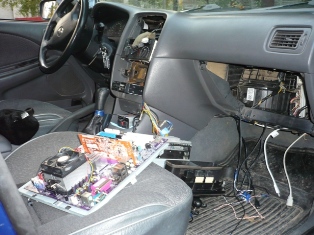 Первый вариант был собран на скорую руку ну потому что уж очень хотелось... Еще тогда родилась мысль разместить все это дело в салоне. Не хватало только сформировавшейся идеи и решимости. И вот, отработав 2 с лишним месяца у моего карпутера накрылась ОС. Так, как для восстановления пришлось снимать и нести домой системник, я наконецто решился все переделать. сразу скажу все что получилось меня до конца не устраивает и постепенно будет совершенствоваться.(о чем буду отчитываться по мере завершения.) пока же выкладываю то что уже сделано. 1.Место установки системной платы было выбрано в бардачке. Точнее вместо бардачка. он уже давно стал оправдывать свое название, ибо складывалось там все что сразу недосуг было выбросить или уложить куда нибудь еще. а так нет места - нет проблемы. 2. Жестяк расположился над центральной трубкой вентиляции салона. зимой я ею практически не пользусь ( нет необходимости. и так жарко). А диск там помещается так что с места ему уже не сдвинуться. 3. Блок питания (обычный. временно используется схема с инвертором) удалось запихнуть только под переднее пассажирское сидение. Ближе к мамке места не нашлось, так что пришлось удлинять провода ( толстая черная "сопля" на след. фото). Нудная хочу вам сказать работа. 4. Все, что есть, пока расставлено по своим местам ( над СП нашлось немного места для GPRS-модема). еще раз все проверяю - работает! Остается только собрать провода и поставить элемены декора на место. И промежуточный результат моего труда. "Художественный" беспорядок в салоне со временем начал порядком раздражать. Наконец организм перестал выдерживать этот хаос и я занялся наведением порядка. (как и обещал). Для начала, раз уж все равно пришлось все разбирать, переместил хард с трубы отопления в нишу справа от бардачка. Сколько тут все таки интересных и сободных мест, если поискать. Его же (харда) место занял GPRS-модем. БП был сдвинут в правую половину пассажирского кресла, что позволило пустить провода под ковриком и накладками порога. ( как сразу не догадался? ) Провода же от монитора спрятал за ним самим, пожертвовав целостностью системы вентиляции салона. И вот результат. По-моему стало чище![]() Ну и пара новых приобретений: Карт-ридер встал вместо пепельницы. Осталось только накладку какую нибудь декоративную для него сврганить. Взял внутренний, так, как на "мамке" остался незадействованым один разъем для усби. ну не пропадать же ему всамом деле. До кучи был приобретен трекбол. Общаться с его помощью с карпутером стало намного удобнее чем с джойстиком на клавиатуре. Взял проводной потому, что приемник от беспроводного куда лепить я уже и не знаю. А так он намертво удобно встал под рукой а ужпроводок от него я куда нибудь спрячу. Кстати последние фото загружал находясь в движении с его помощью. Весьма... ![]() Последний раз редактировалось нордман; 13.11.2008 в 17:12. |