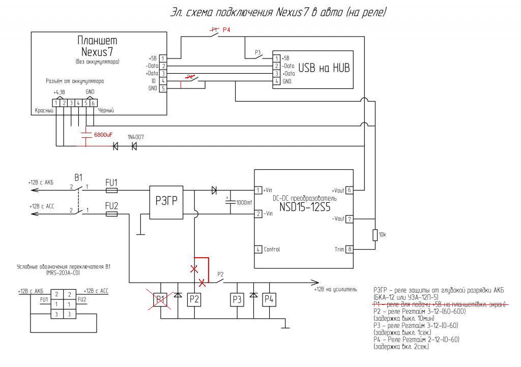 Диоды нужны, чтобы была разница по напряжению и планшет думал, что он заряжается, соответствено включал экран.Если я не прав - поправьте. Р4 включает/отключает режим OTG. К как/в каком месте Вы его включаете после подачи напряжения на Хаб? Вообще, правильно ли я соединил планшет с Хабом? Делал по своему разумению. P.S. Схема не верна - уточняется в последующих постах