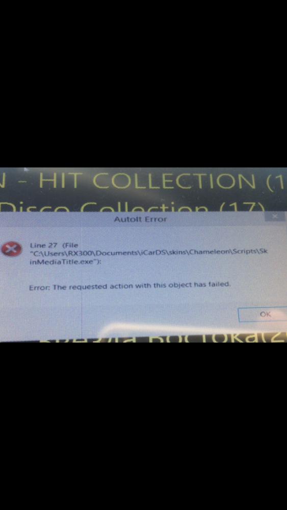 Это ошибка выполнения скрипта autoit - SkinMediaTitle.exe. В скрипте создается объект "$rr = ObjCreate("RideRunner.sdk")", к нему в цикле идет обращение - 27 строка: $foobarwindowtitleprev = $rr.getinfo("=$CurrentSkinMediaTitle$"). А так как Икар закрылся, вылетает ошибка, т.к. объект $rr пропал.