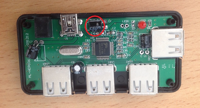 Nexus 7 2012, стоит прошивка Тимура, Fast Charging включен. Питание на планшет и на D-Link H7 подается через NSD15-12S5, все нормально работает. Подключил к D-Link'y еще один хаб, вставил в него флешку - определяется, закинул в бардачок. Спустя на пару дней смотрю на хаб и вижу такую картину. Похоже, что сильно греется конденсатор, обведенный красным. До этого в домашних условиях такого не наблюдалось. Доп. питание ко второму хабу не подключалось. Кто может предположить, в чем причина?