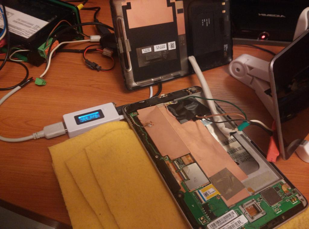 Возвращаясь к вопросу "Нужно ли выпаивать датчик холла?". На фото два планшета в режиме "сна". Один с выпаянным датчиком, другой, не тронутый. С выпаянным датчиком - шкала тестер не фиксирует потребление тока. Без выпаивания - 280мА. Какое-то безумно большое значение.