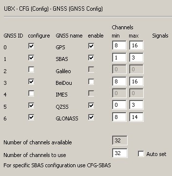 А кто его знает, что там есть, нужно экспериментировать, на что нехватает времени. Я просто подключил модуль к u-center и открыл окно данных, окно настроек. Если снять галочку напротив Глонасс и нажать Send, то в логе можно увидеть, что отправляется модулю. Наверное, там еще информация о каналах, еще что-то. Но для сохранения настроек во флеш памяти еще нужно нажимать Save, что я не делаю, поскольку смысла нет - все равно не сохраняет настройки. И отправленные через send параметры действуют пока есть питание и заряд на ионисторе. У меня держит секунд 40 после отключения, и затем забывает.