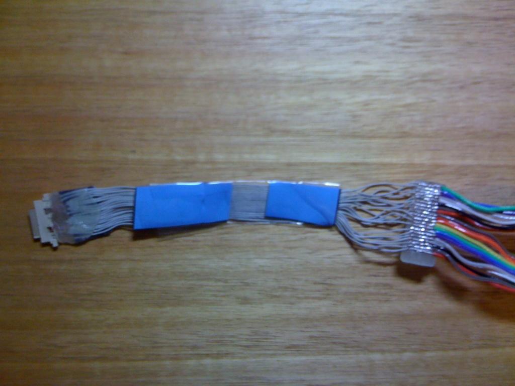 Да посмотрел внимательно, ничего вроде не погорело. Причем такого транса который горел у Вас (если не ошибаюсь это вы фотографии выкладывали) у меня помоему даже нету. А так посмотрел внимательно ничего сгоревшего нет. У меня монитор включился, но горит белым, при этом по мере загрузки монитор мигает. Вобщем непонятно как то... Вот думаю может шлейф какой неправильный. Жилы в этом шлейфе чуть толще чем в 40 пиновом IDE шлейфе. На фото он и есть. Я сейчас заказал новый шлейф, скоро должен прийти. Проверю все ли в порядке если да, то буду продолжать эксперименты. Сейчас пробую собрать по технологии предложенной в форуме, ссылка на который в моем первом посте.