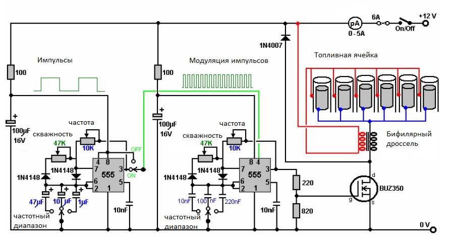 Насчет железа. Нужна сталь марки 316L (США AISI) или СНГ ГОСТ 03х17Н13М2 возможная замена 316LN (США AISI) или СНГ ГОСТ 03х17Н13АМ3. На одном из форумов предлагают использовать сталь от набора посуды, т.е. лопатку для переворачивания блинов (какая там сталь под вопросом) зазор между пластинами 3мм. Еще выбрать какой тип реактора использовать трубчатый или пластинчатый. Трубчатый сложнее в изготовлении (трубы надо искать подходящего размера или изготовлять самостоятельно) но если у него КПД выше то можно повозиться. Насчет раствора. Одни используют 20% щелочной раствор на воде или морскую соль с водой или поваренную соль. Другие KOH. Третьи обычную воду. Лучше подумать на обычной воде. Насчет питания. Напрямую от аккумулятора реакция идет в любом растворе. Но вопрос стоит об увеличении количества выделяемого газа. Предлагают импульсный вариант. Смотри схему. Главное подобрать резонирующую частоту для молекулы воды и установить паузу для восстановления воды. Еще надо решить вопрос с выделяемым кислородом. Пишут, что когда начинается процесс гидролиза первоначально начинается выделение водорода, а потом идет кислород. Вот тут и надо делать паузу. Небольшое количество кислорода должно вроде как раствориться в воде. Другие варианты это использовать «Трансформатор Тесла» – как плазменный гидролиз (высокотемпературный) как на том сайте, где используются графитовые стержни от батарейки. Можно подумать приспособить «Умножитель напряжения» из телевизора там помнится 10000вольт на выходе. Электронщик Я слабый тут у меня проблема. Насчет Лямбды. У меня есть схема проверки Лямбды. По описанию данный прибор предназначен для измерения показаний датчика кислорода (lambda sensor,oxygen sensor) и его имитации (для проверки исправности входных цепей и контура управления впрыском топлива по показаниям датчика кислорода) в архиве файл PDF. Может ее как то можно использовать. Если есть другие варианты то, пожалуйста, предлагайте. |