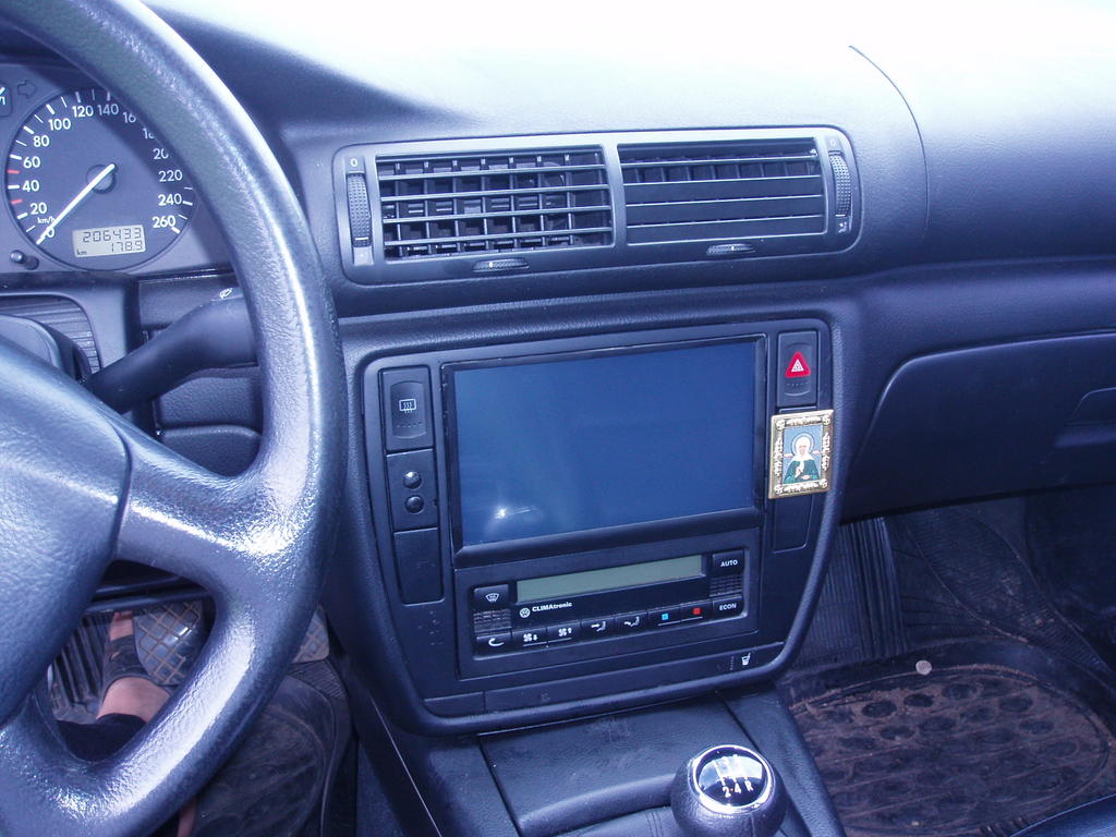 После приступил к инсталяции. Так как у меня passat 1997 года, у меня панель не была расчитана на 2 din (сверху стоял климат контроль, ниже магнитола 1 din, ниже полка, фото не сделал). На разборе купил панель от passat b5+ с местом под 2 din, после чего поработав немного кусачками и паяльником, поставил данную панель в машину. Монитор разобрал, матрицу прикрепил к панели с тыльной стороны, с наружи прикретил рамку, которую вырезал из корпуса монитора, вот как получилось (в процессе установки фото не делал):