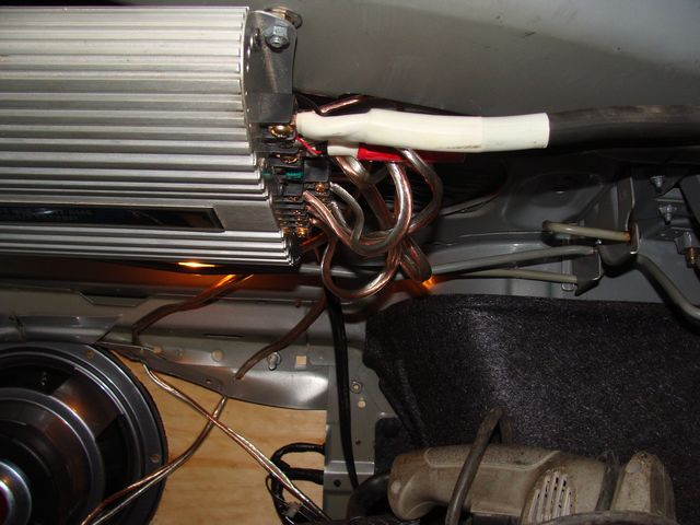 фанерных листов, по 20 мм каждая и вставлен за задним сиденьем ,проводку делал силиконовым кабелем 2,5 квадрата ,силовые кабеля отдельно плюс и минус по 35 кв каждный ,были брошены по лонжерону ,прихвачены стальными стяжками к топливным трубкам ,естественно каждый в своей стальной оболочке, для саба поставил кросовер с кетайской головой все это вроде как работало ,но чего-то не хватало |